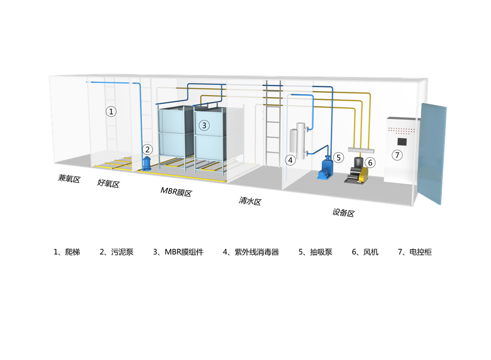 设备分为五个区,缺氧区中兼氧微生物将难溶解大分子有机物转化为可溶解性小分子有机物,同时通过回流的硝态氮在硝化菌的作用下,进行硝化和反硝化去除氨氮。好氧区通过活性污泥的生化降解和吸附作用,去除污水中的有机物质,使污水中的有机物含量大幅度降低,在氧量充足的条件下降解污水中的氨氮。膜区通过高污泥浓度进一步净化废水,并实现固液分离。最终出水达标排放或回用。