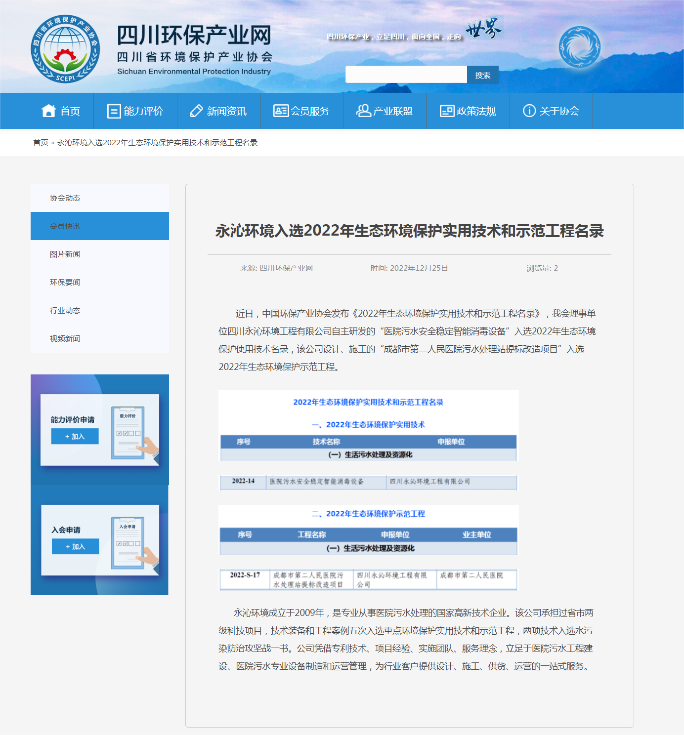 2022年度,我司2项技术装备入选。医院污水安全稳定智能消毒设备入选重点生态环境保护实用技术,成都市第二人民医院污水处理站提标改造项目入选生态环境保护技术示范工程。