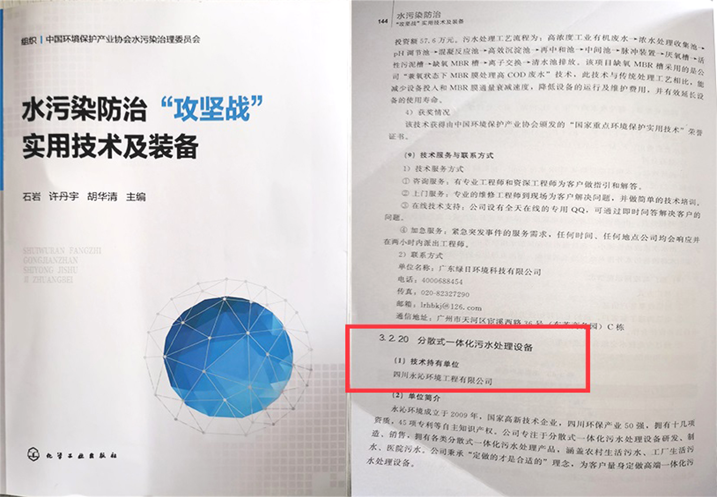 公司2项核心技术装备,分散式一体化污水处理设备、智能高效医院污水消毒装置载入《水污染防治“攻坚战”实用技术及装备》一书。