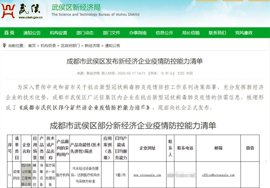 近日,公司医疗废水处理产品入选成都市武侯区发布新经济企业疫情防控能力清单。本次武侯区共有29个产品入选,我公司是唯一一家医疗废水处理企业。