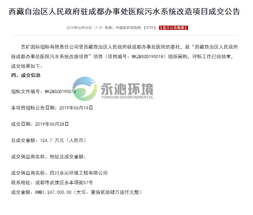 项目内容:西藏自治区人民政府驻成都办事处医院污水系统改造,中标金额为124.7万元。