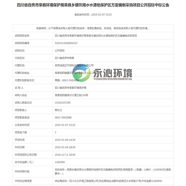 日前,我公司中标四川省自贡市荣县环境保护局荣县乡镇饮用水水源地保护区方案编制采购项目。公司凭借强有力的技术团队,提出了完美的方案设计理念,从而在众多竞争者中脱颖而出,顺利中标。