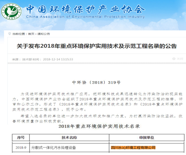公司一体化设备入选2018重点环境保护实用技术