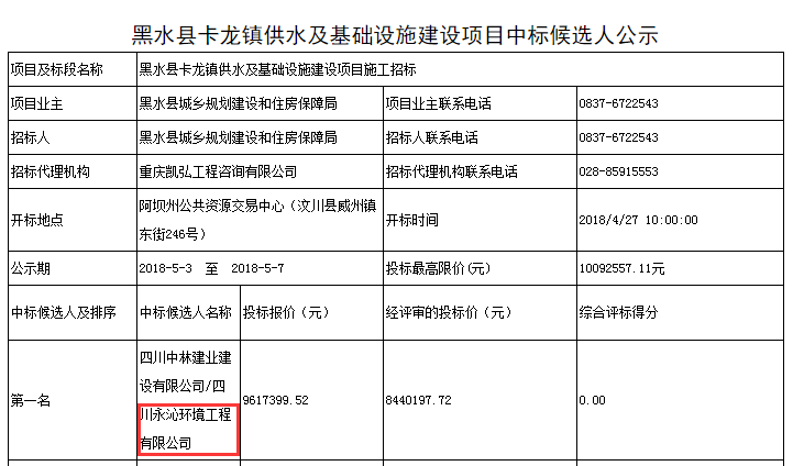 日前,我公司中标“中标黑水县卡龙镇供水及基础设施建设项目”。项目新建供水厂一座,设计规模近期400立方/天,远期800立方/天,配套输水管网7500米,配套附属基础设施。该项目我公司以环保专业公司的身份联合中林建设中标,中标金额961.73万元。