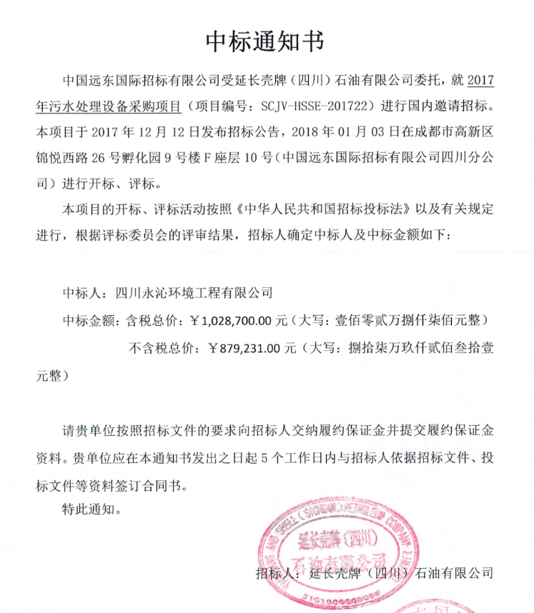 公司中标壳牌9个加油站2017年污水处理设备采购项目
