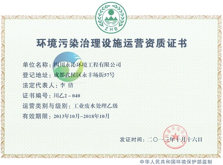 公司获得环保厅颁发的工业废水运营乙级资质,生活污水运营乙级资质。这两项证书将使公司的业务更加多元化,在污水运营方面的实力得到极大的提升。目前公司具备建设行政主管部门颁发的环保专业承包三级资质;环保行政主管部门颁发的工业废水运营乙级,生活污水运营乙级;环境污染防治工程甲级。
