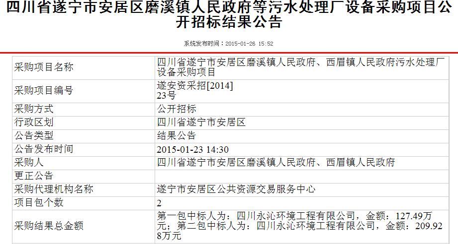 日前,公司再次中标两个乡镇污水厂项目,遂宁市安居区磨溪镇人民政府污水处理厂设备采购项目和遂宁市安居区西眉镇人民政府污水处理厂设备采购项目。