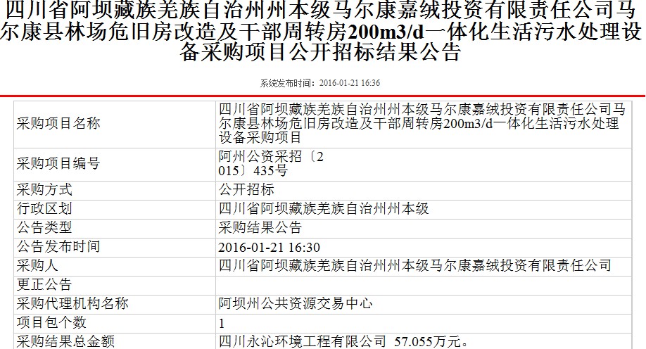 公司中标四川省阿坝藏族羌族自治州州本级马尔康嘉绒投资有限责任公司马尔康县林场危旧房改造及干部周转房200m3/d一体化生活污水处理设备采购项目。