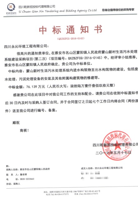 公司中标雅安市名山区蒙阳镇人民政府蒙山新村生活污水处理系统建设采购项目,项目采用综合评分法,我公司凭借综合实力成功从数十家公司中脱颖而出。