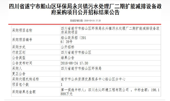 公司中标遂宁永兴镇污水处理厂二期扩能减排设备采购项目