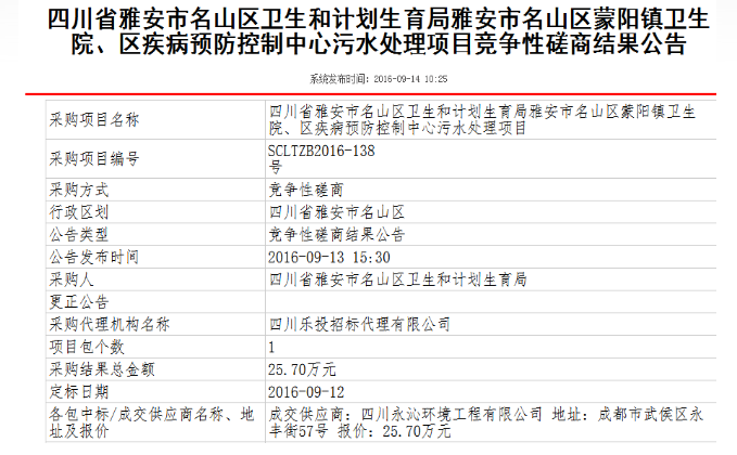 公司中标雅安名山蒙阳镇卫生院、区预防控制中心污水处理项目