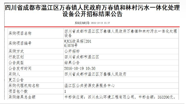 2016年10月19日,我公司成功中标——四川省成都市温江区万春镇人民政府万春镇和林村一体化设备。该项目中标金额:353200元,该工程内容为:为业主提供一体化污水处理设备。该设备是我公司22项专利设备之一的特色设备,在乡镇污水中运用尤其广泛,取得的效果也非常显著,设备专利号为:ZL 2014 2 0236292.4。
