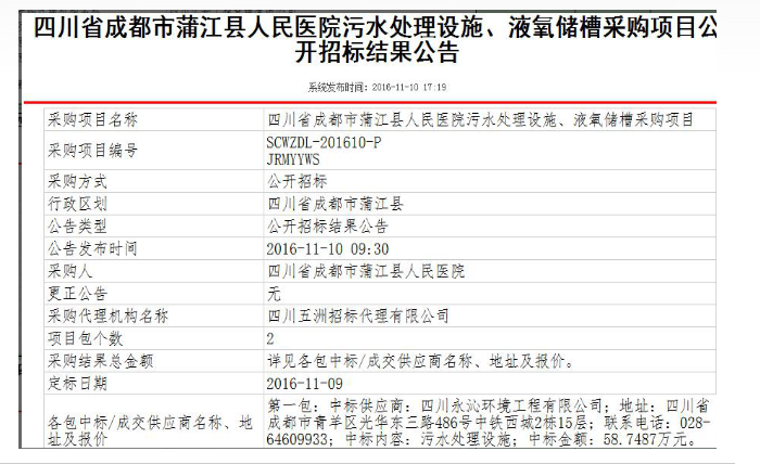 公司中标成都蒲江县人民医院污水处理设施、液氧储槽采购项目