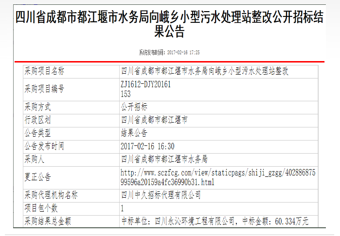 2017年2月16日,我公司成功中标——四川省成都市都江堰市水务局向峨乡小型污水处理站整改项目。该项目中标金额:60.334万元,该工程内容为:为业主处理生活污水,并达到排放标准。