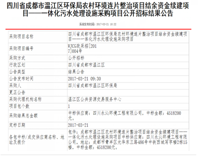 2017年3月21日,我公司成功中标——四川省成都市温江区环保局农村环境连片整治项目结余资金续建项目—一体化污水处理设施采购项目。该项目中标金额:4518200元,工程内容:为业主提供11套一体化污水处理设备及其配套设施的设计、安装、调试和售后服务。