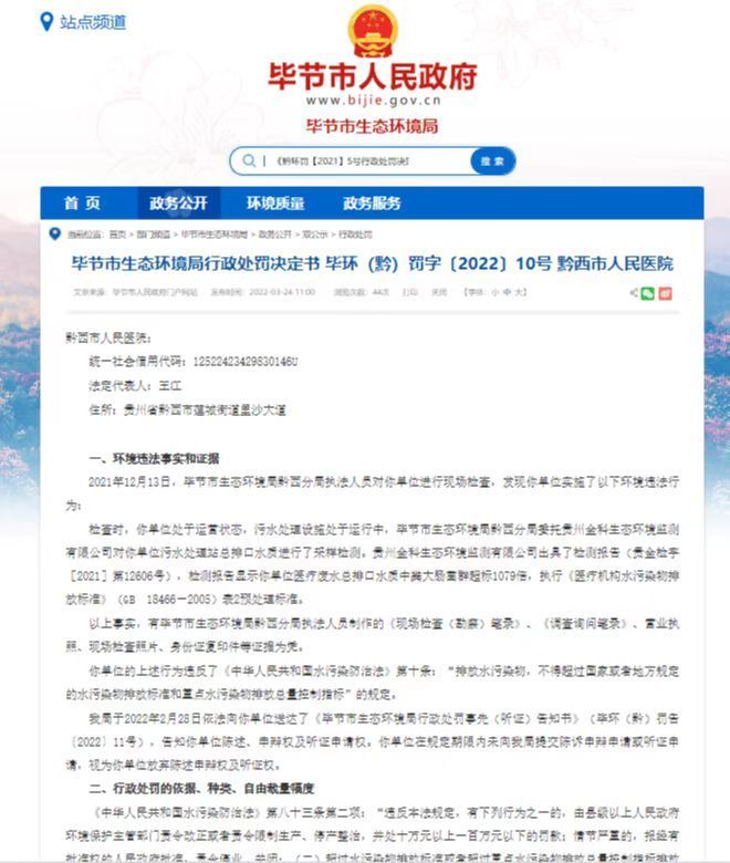 2022年3月15日,毕节市生态环境局对黔西市人民医院作出处罚30万元的决定(近日,华商报大风新闻记者从毕节市生态环境局官网证实,相关处罚在该网确有记录)。