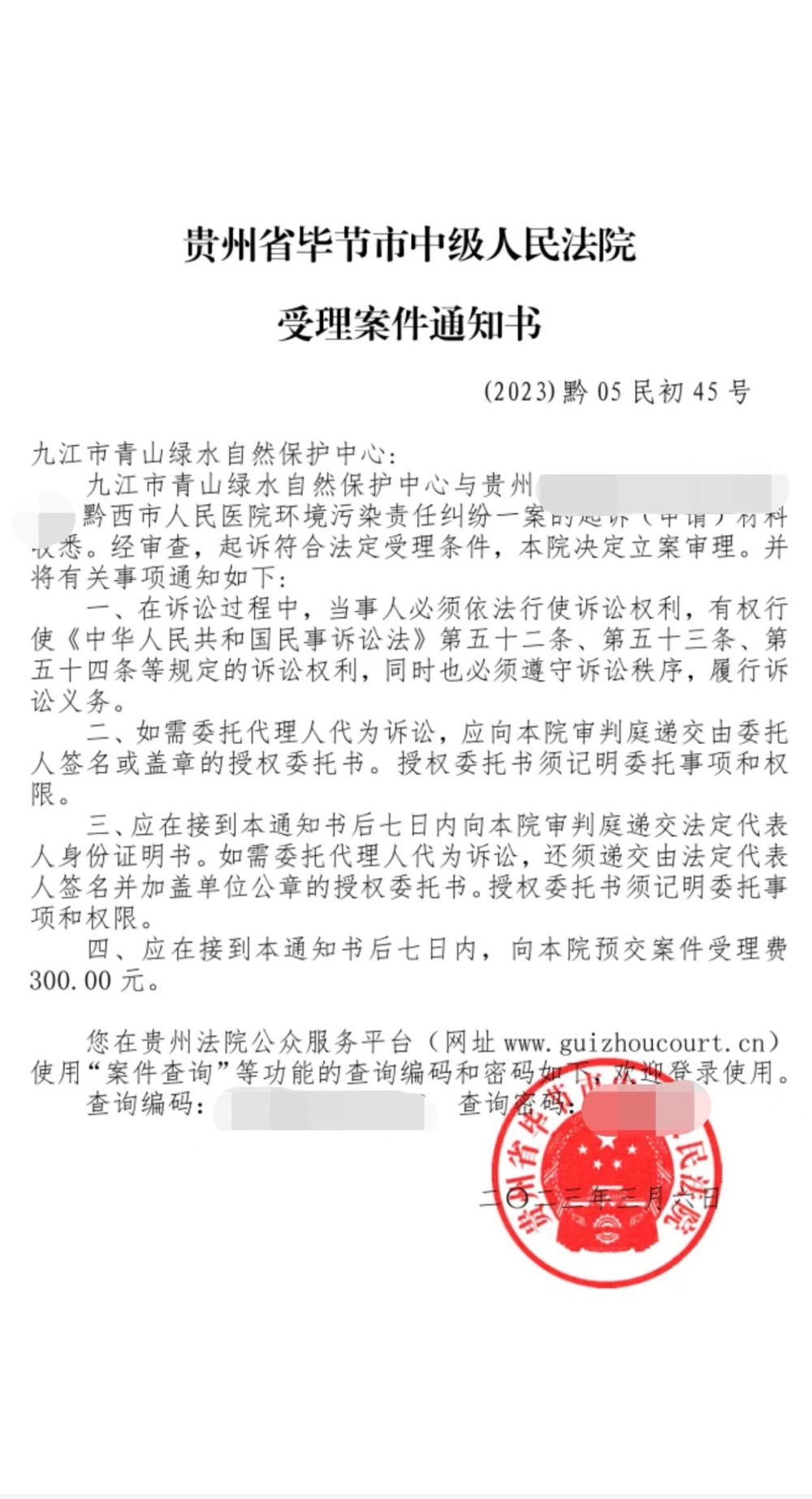 近日,华商报大风新闻记者从九江市青山绿水自然保护中心获悉,该中心诉黔西市人民医院环境污染责任纠纷一案,毕节市中院已立案,目前正等法院开庭审理。