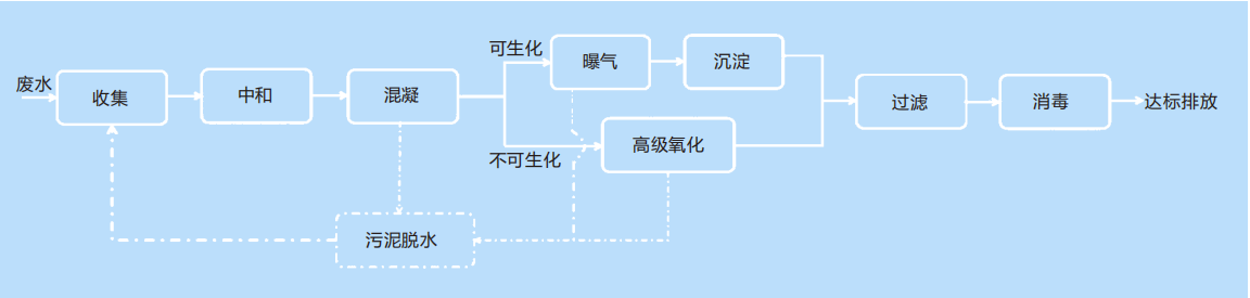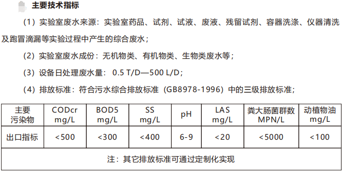 永沁环境实验室废水处理装置由废水收集调节、酸碱中和、混凝沉降、生化处理、泥水分离、污泥脱水、高级氧化、吸附过滤、消毒等工艺组合。前处理工艺包括收集、中和、混凝,末端处理工艺包括过滤、消毒,可生化废水采用曝气、沉淀工艺,不可生化废水采用高级氧化工艺,污泥脱水后处置。