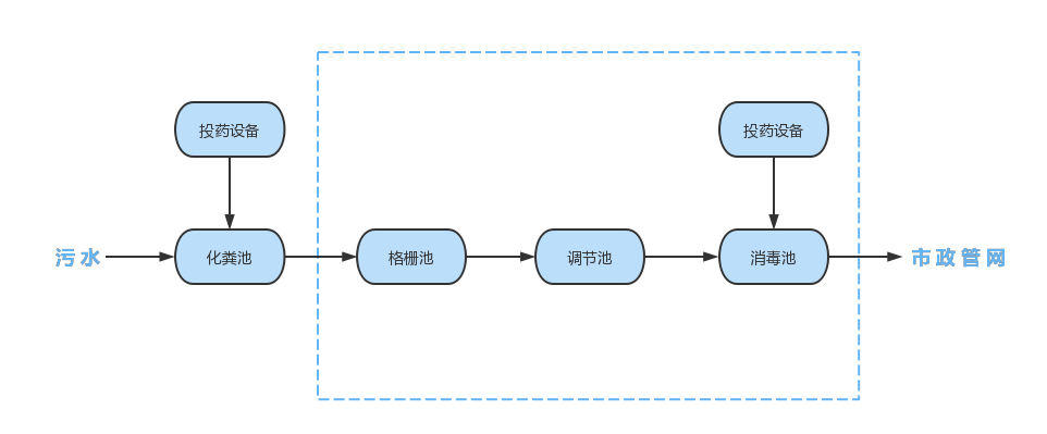流程描述:在化粪池前端投药预消毒,然后通过水泵将污水泵入移动式快启医院污水强化消毒成套装置,装置分为三个功能区,首先进入格栅池,拦截漂浮物、杂物;污水流入调节池调节水量后进入消毒池,消毒后排入市政管网。核心单元消毒池采用三项特别的技术,保障消毒效果。消毒池前端采用旋涡混合技术,快速彻底的完成污水和消毒剂的混合;药水混合后经过挤压式通道,强化接触效果;后端采用折叠墙,避免水流短路,保障全部污水都有充分的接触时间,确保消毒效果。