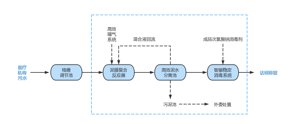 智能高效稳定医院污水处理装置由复合生物反应、高效泥水分离与智能稳定消毒构成。生化采用泥膜复合反应器,该单元活性污泥和生物膜耦合共生,降解有机污染物;沉淀采用高效泥水分离器,该单元是高效澄清技术与污泥浓缩技术的结合,实现泥水分离;消毒通过医院污水安全稳定智能消毒投药设备投加消毒剂,精准投药,实现杀毒灭菌。